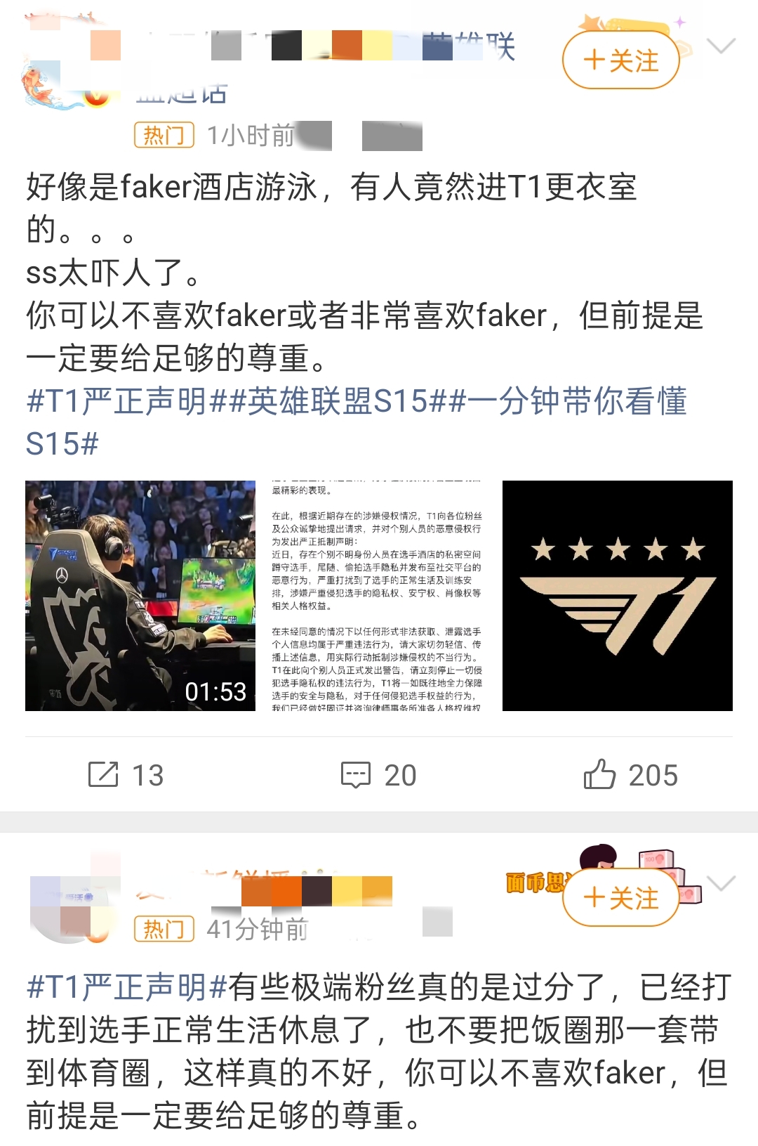 T1抗议LPL粉丝饭圈行为作为即将向六冠王发起冲击的T1,最近则突然向LPL粉丝提出了抗议!T1俱乐部官方发文表示,最近总有个别不明身份的人员在酒店的私密空间内,对T1选手们进行跟踪尾随或偷拍,这种行为无疑已经构成了侵权,并警告如果不及时停止这种侵权行为的话,T1俱乐部已经做好了通过法律途径维权的准备。
