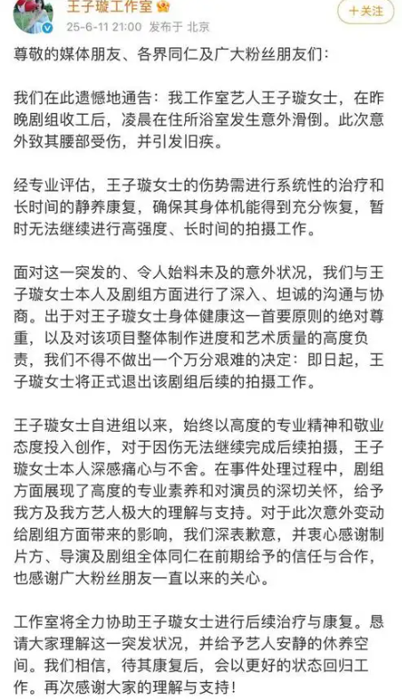 6 月 11 日,一则令人揪心的消息在娱乐圈传开:女演员王子璇工作室发布声明,称王子璇于昨晚剧组收工后的凌晨,在住所浴室不慎滑倒,腰部受伤并引发旧疾。经专业评估,她需接受系统性治疗和长时间静养康复,因此将正式退出正在拍摄的电视剧《她的瞳》后续拍摄工作。