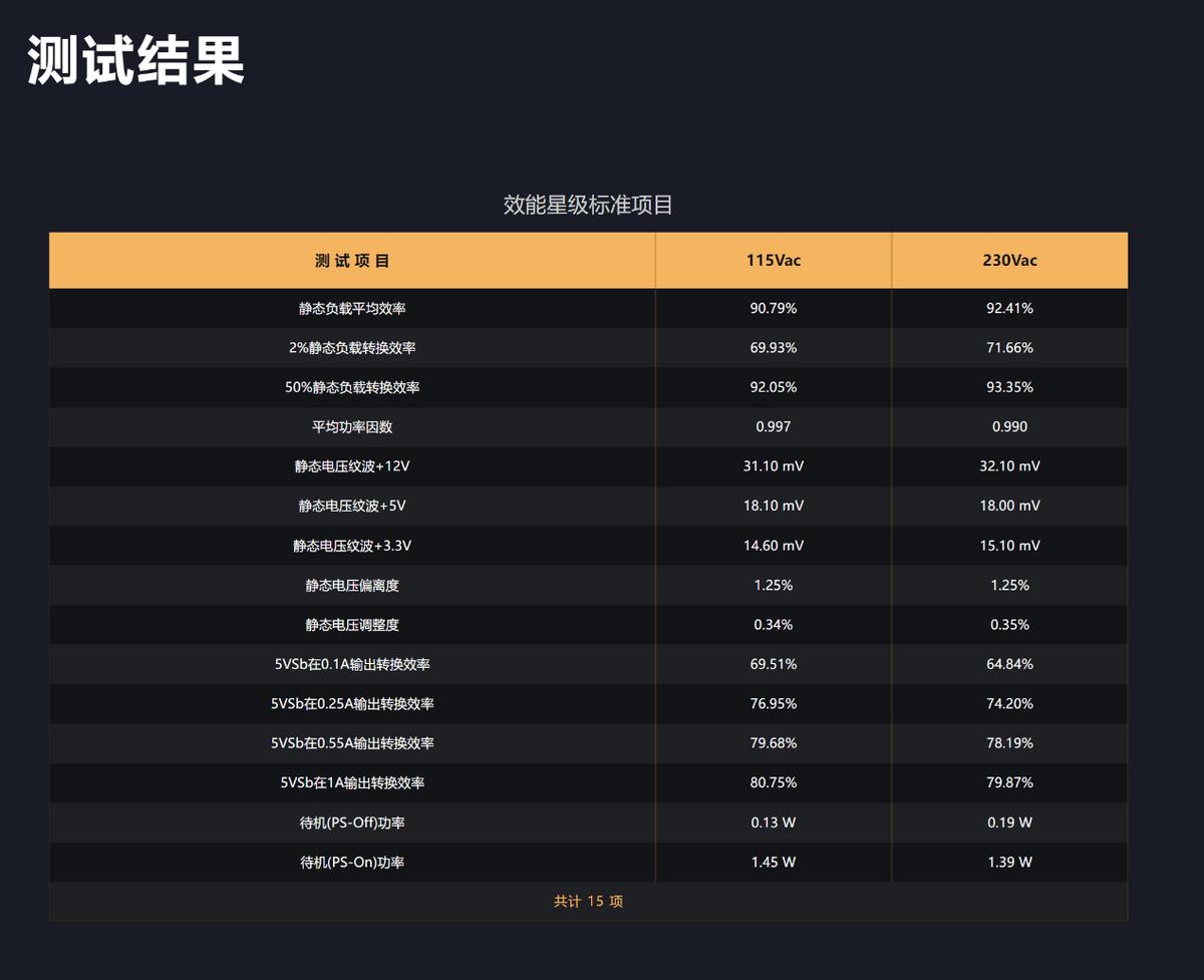 F10 ATX3.1白色版是真实通过80PLUS白金牌115V认证的;从80PLUS认证信息我们可以看到,F10 ATX3.1白色版在10%负载下具备88.91%转换效率,在20%下则为91.65%,50%为92.41%,100%为89.24%;整体转换效率符合115V白金牌水平。
