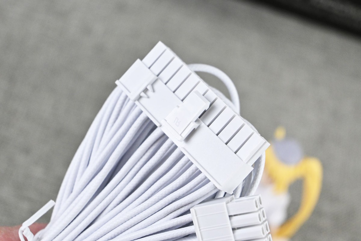 F10 ATX3.1白色版在线材部分做了较大升级改进,新款的压花压纹线材在柔软手感方面下了相当功夫,毫无疑问,对比同期以蓝方案和CWT方案更显出色。