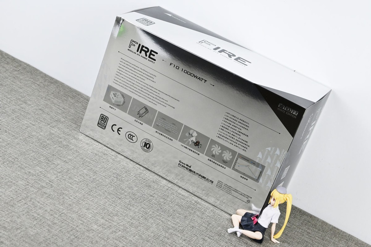 相比之前Fire系列黑色版电源,管家本次入手的长城猎金Fire F10 ATX3.1白金全模组电源白色版(下文简称“F10 ATX3.1白色版”)包装上做了定制化处理,在黑色版银黑配色主题基础上做了反色处理,并在包装表面标明白色版字样,颇有巧思;从包装可以看出电源支持ATX3.1和PCIE5.1,并通过了80PLUS 115V白金牌效率认证,作为长城猎金高端系列, F10 ATX3.1白色版支持10年质保服务。