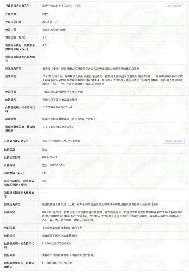 新京报贝壳财经讯(记者于梦儿)12月9日,新京报贝壳财经记者从信用中国官网获悉,近期,位于济南万象城的香奈儿彩妆及纪梵希彩妆门店均因粉底试用装过期被处罚。
