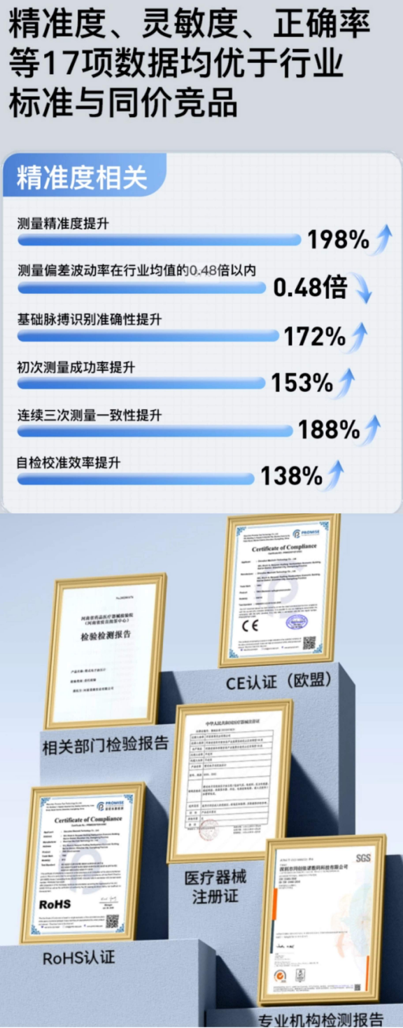 町石血压计采用了目前行业内最先进的无距传感测压技术,将双通道SOC硬核芯片、高精度双滤波稳定算法、自研三重校准算法、双循环检测传感器、增压过程与筒壁无距衔接。这是一种医用级准确测量技术,相较其他血压计测速更快,测量更准确,结果更准确,数据更稳定。对比报告显示灵敏度提升126%,相较其他町石准确度提升198%,稳定率提升102%,是测评过的产品里面整体表现最好的,效果足以媲美院线专业测压仪。