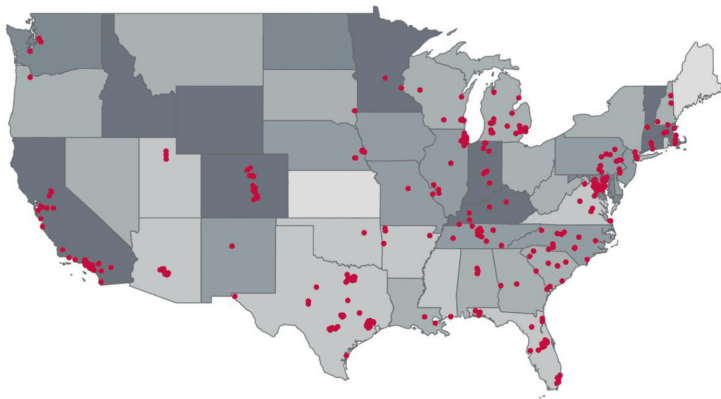 然而,资本的布局不仅仅是追随需求,更是在追随利润。当我们把目光转向资本实际落子的地方,情况就变得更有意思了。从图中可以看到,密密麻麻的红色点位代表了被私募股权基金收购的康复服务站点。对比两张图,你会发现一个惊人的规律:红色的资本触角,几乎精准地伸向了那些患病率高、且人口密集的区域,如加利福尼亚州、得克萨斯州和佛罗里达州等地。