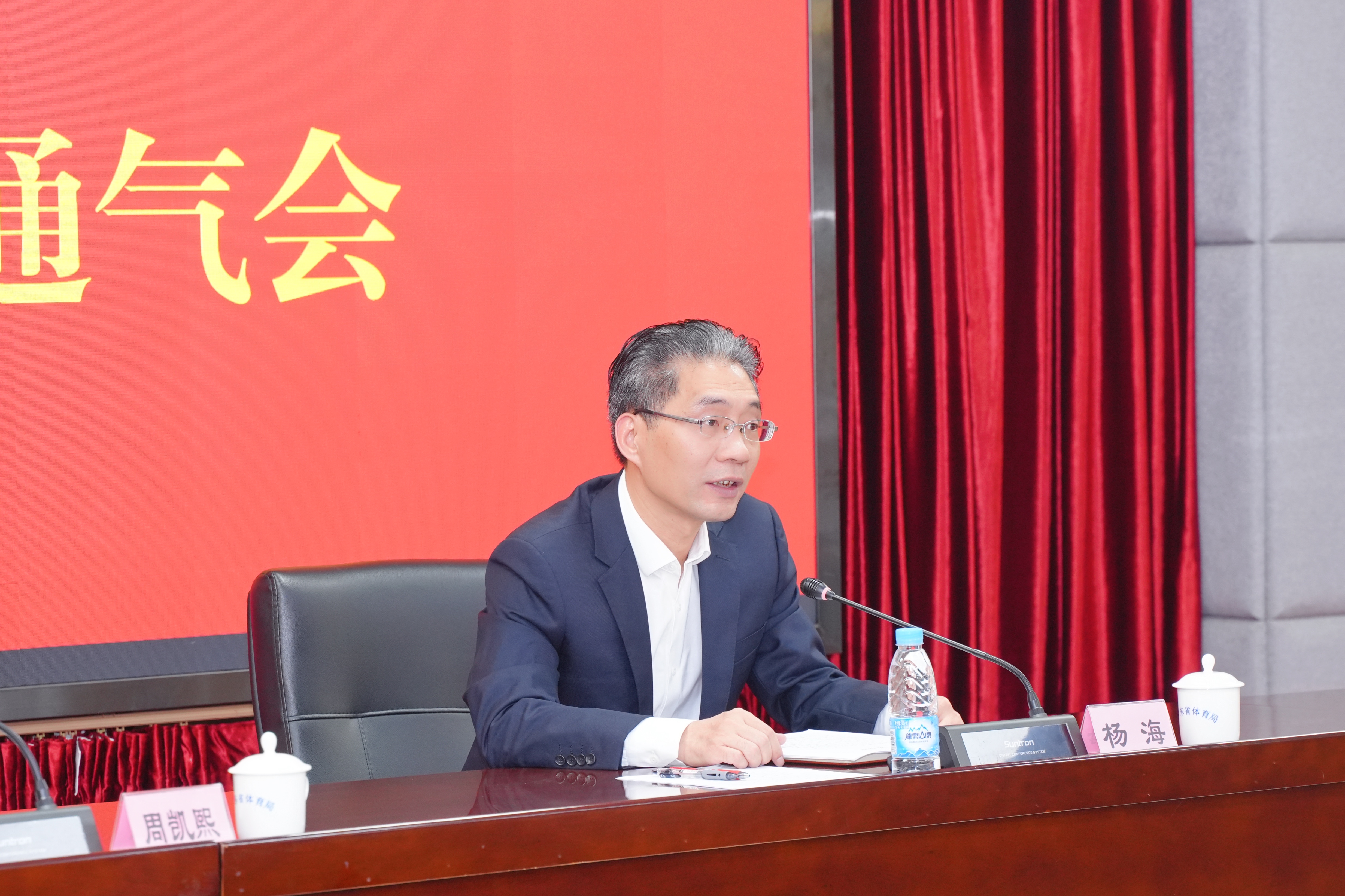 第十五届全国运动会广东省代表团副团长、秘书长杨海在介绍情况。