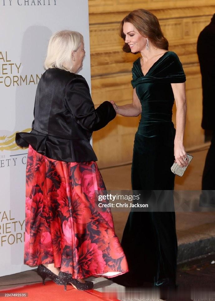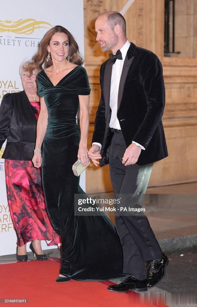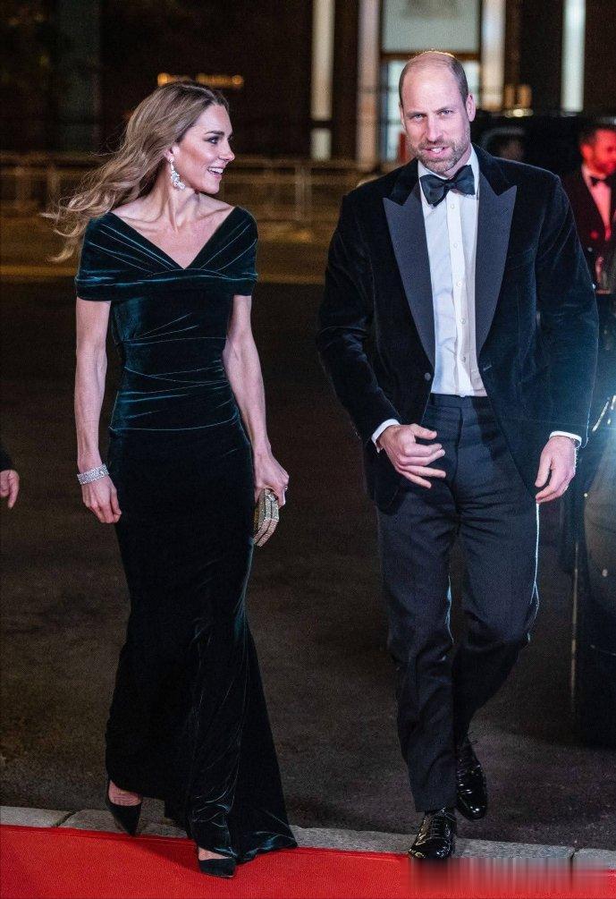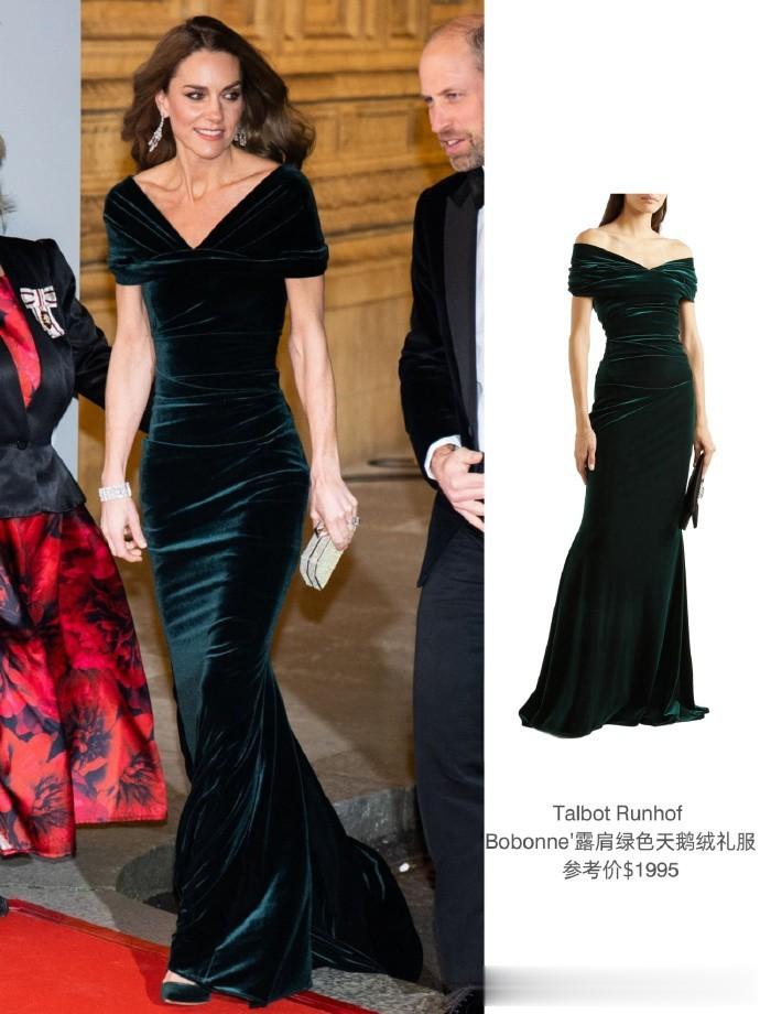凯特王妃这次的造型也是让人眼前一亮,175cm的身材,高挑纤细,真是天生的衣架子。她这次选择了一袭来自德国品牌Talbot Runhof的墨绿色金丝绒鱼尾裙,配上同色的Manolo Blahnik丝绒细高跟,款款走来,优雅又贵气。