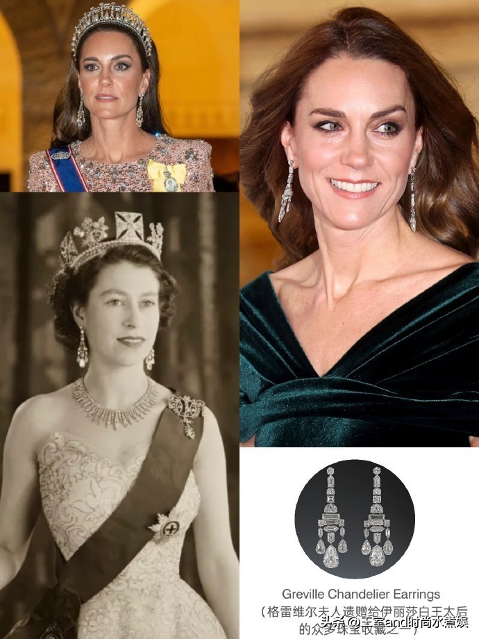 搭配伊丽莎白女王的格雷维尔吊灯钻石耳坠以及玛丽王后的钻石手镯,凯特王妃这次真是光彩照人,夜幕之下也无法掩盖珠宝璀璨的光芒,尽显王储妃的雍容华贵。
