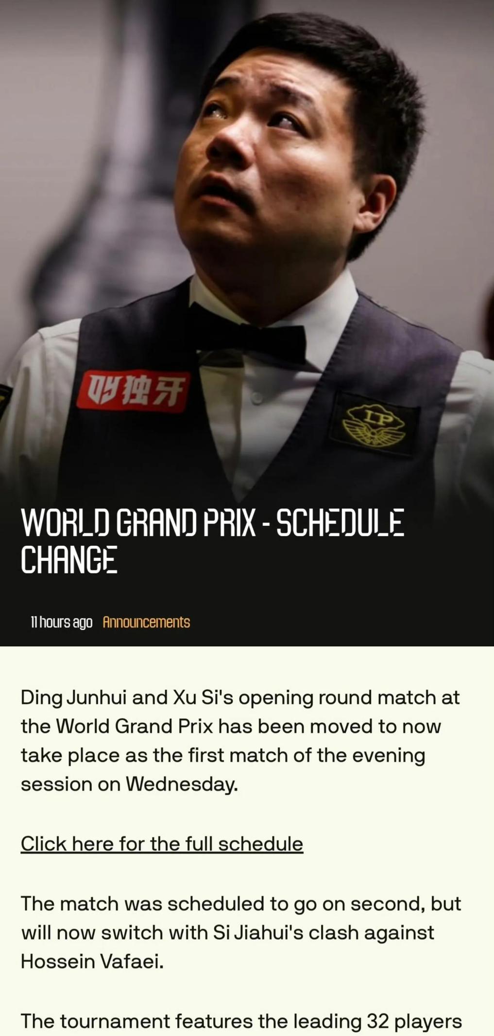斯诺克世界大奖赛第二天,六位中国选手登场,丁俊晖对阵徐思成焦点战,比赛时间调整到黄金档,引发关注和讨论,两人过往交手丁俊晖占优,本次对决悬念重重,球迷期待精彩较量。