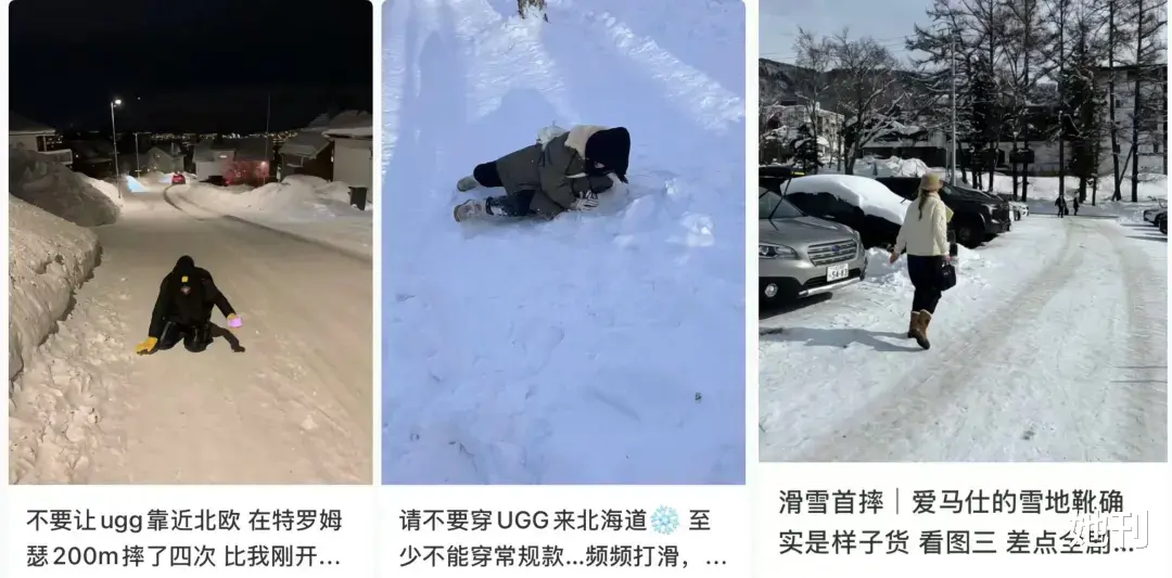 在“穿雪地靴滑倒”的词条中,许多女生分享在雪地里摔到怀疑人生的经历,她们穿着的雪地靴中,常常出现一些昂贵大品牌的身影。