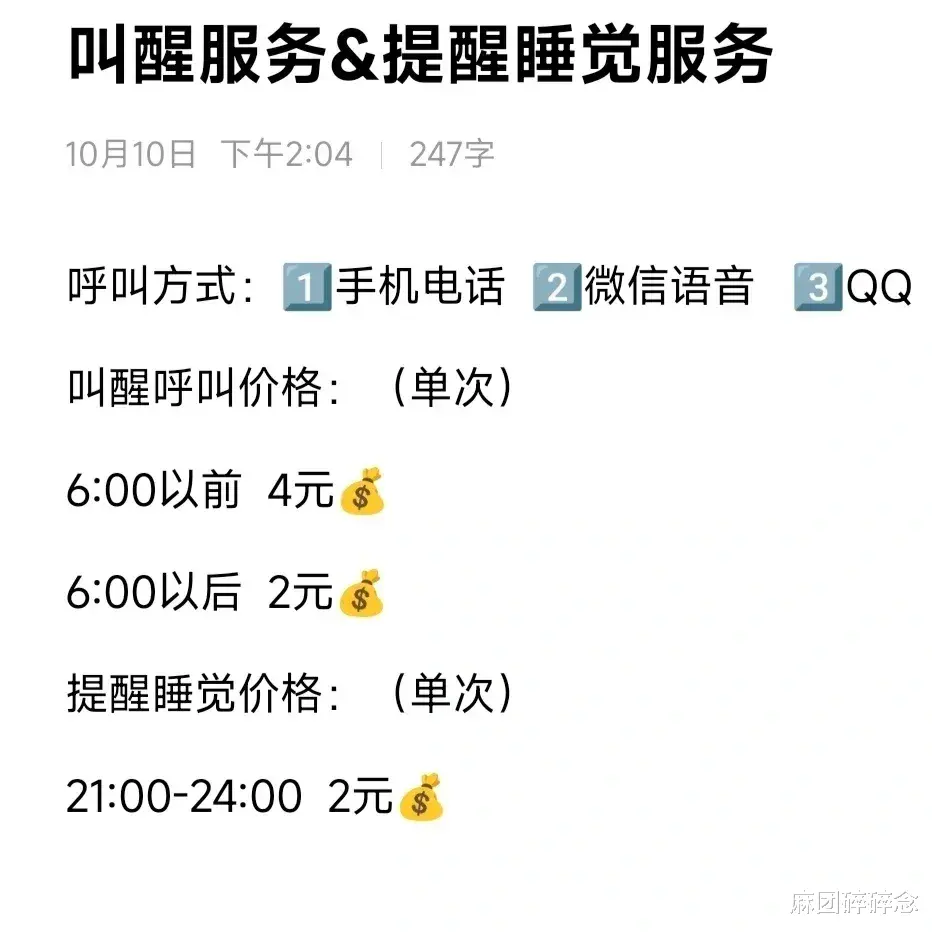 在年轻人普遍孤独化,情感需求大的当下,一些小机灵鬼开始提供真人叫醒服务,工作是远程叫你起床,按次收费,不费吹灰之力搞点零花。