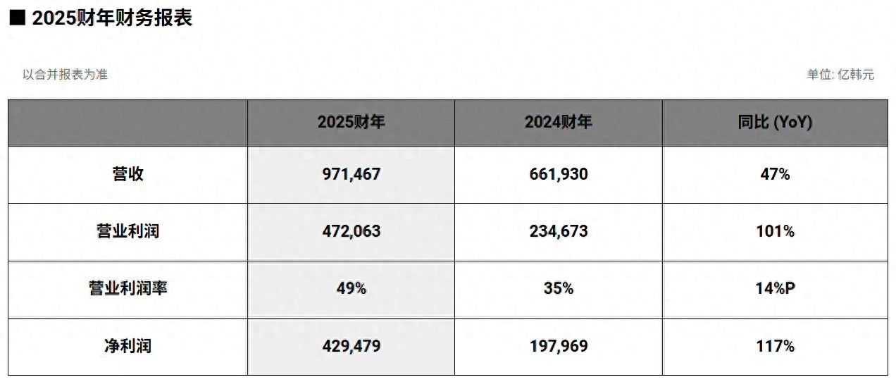 DoNews1月28日消息,SK 海力士今日发布截至 2025 年 12 月 31 日的 2025 财年及第四季度财务报告:2025 财年营业收入为 97.1467 万亿韩元(现汇率约合 4674.7 亿元人民币),同比增长 47%;营业利润为 47.2063 万亿韩元(现汇率约合 2271.57 亿元人民币,营业利润率为 49%),同比增长 101%。