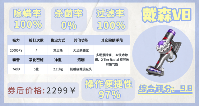 品牌10:戴森 V8 Focus Mattress(参考价:2299 元)|综合评分 9.8 分核心亮点20000Pa 大吸力(115AW)+ 双层气旋技术,无线续航 40 分钟,25cm 宽嘴两用吸头 + 窄缝吸头 + 防缠绕螺旋吸头,5 重过滤,2.15kg 轻便机身。