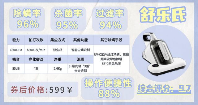 品牌5:舒乐氏除螨仪(参考价:699 元)|综合评分 9.7 分核心亮点18000Pa 大吸力(10 款中顶尖)+48000 次 / 分钟拍打,除螨率 99.9%+UV-C 杀菌,发热滚刷除湿,水洗滤芯,5 米长电源线。
