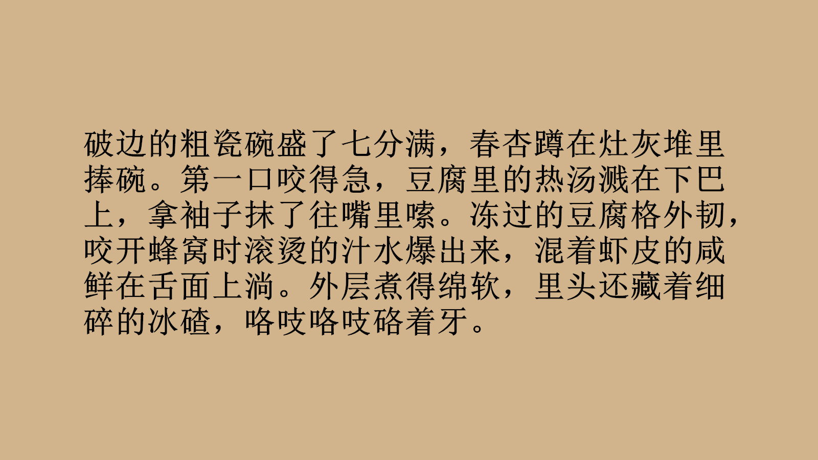 破边的粗瓷碗盛了七分满,春杏蹲在灶灰堆里捧碗。第一口咬得急,豆腐里的热汤溅在下巴上,拿袖子抹了往嘴里嗦。冻过的豆腐格外韧,咬开蜂窝时滚烫的汁水爆出来,混着虾皮的咸鲜在舌面上淌。外层煮得绵软,里头还藏着细碎的冰碴,咯吱咯吱硌着牙。