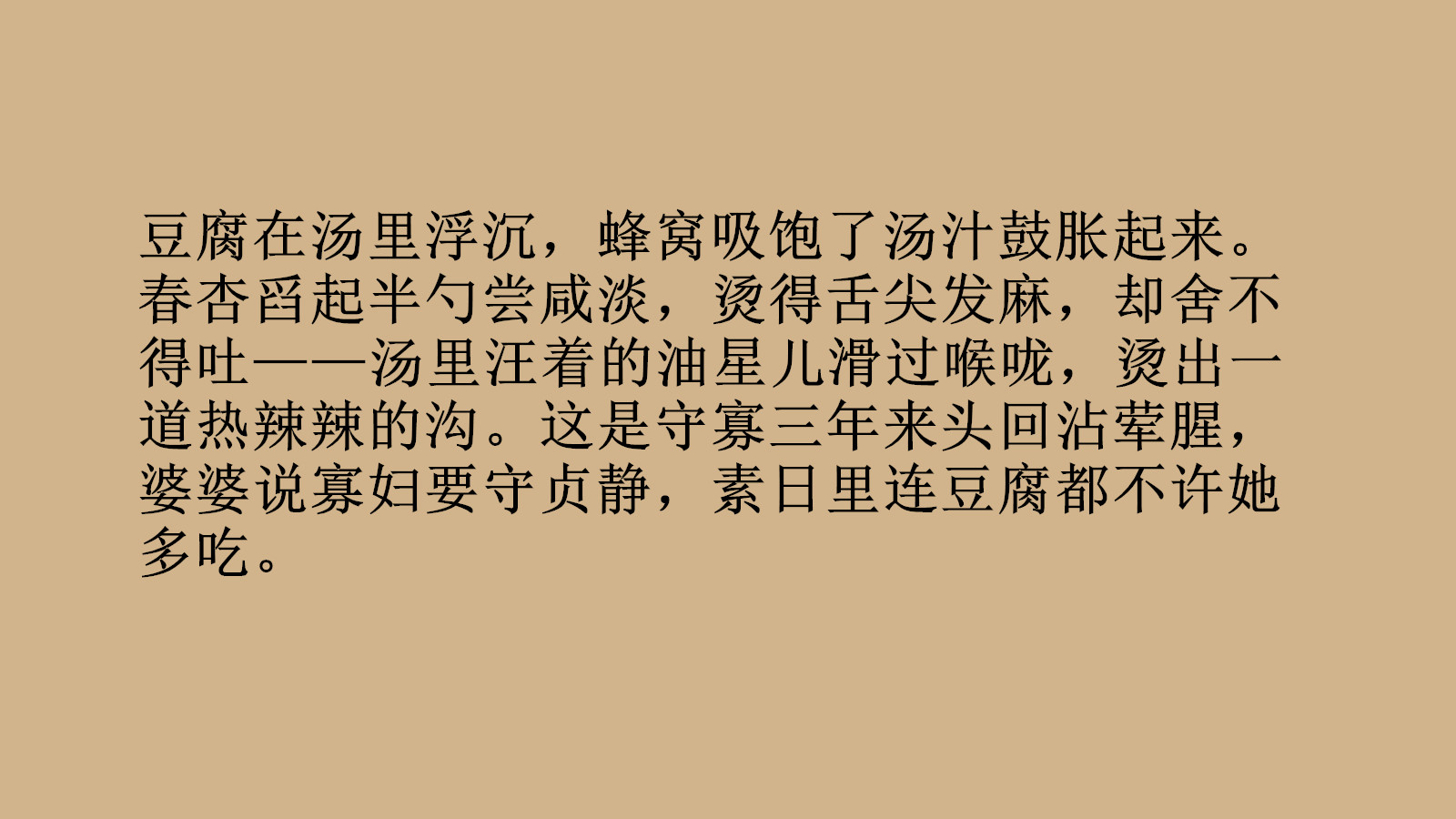 豆腐在汤里浮沉,蜂窝吸饱了汤汁鼓胀起来。春杏舀起半勺尝咸淡,烫得舌尖发麻,却舍不得吐——汤里汪着的油星儿滑过喉咙,烫出一道热辣辣的沟。这是守寡三年来头回沾荤腥,婆婆说寡妇要守贞静,素日里连豆腐都不许她多吃。