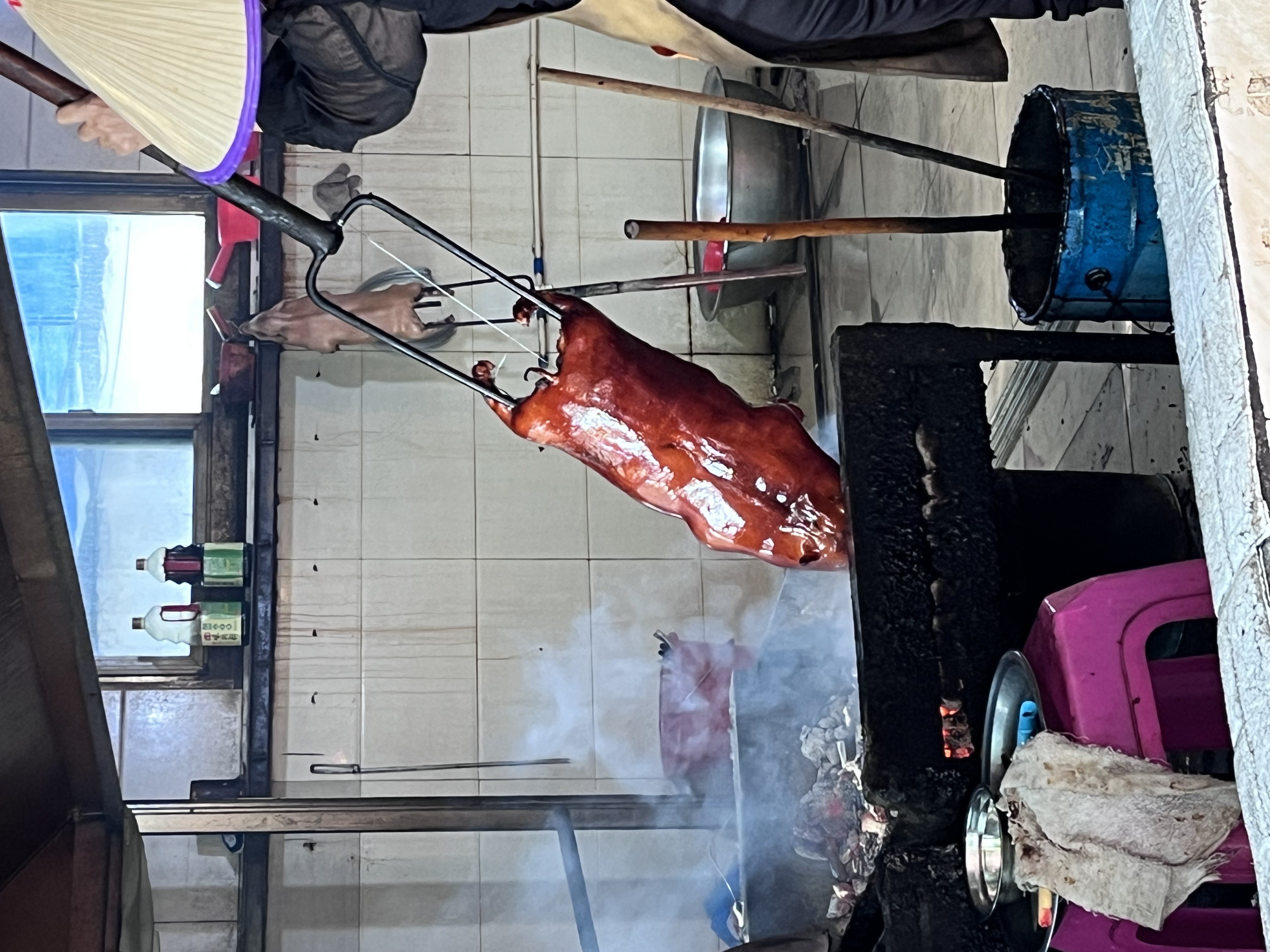 腌好后,进入烤前处理。用沸水均匀淋烫猪皮,使毛孔张开,有助于后续脆皮形成。随后趁热在猪皮上均匀刷上一层白醋与少量料酒混合液,再撒上粗盐,帮助脱水并提升脆度。接着将乳猪固定在烤架上,腹部填入葱段、姜片以去腥增香,用铁钩挂起,置于通风处风干4至6小时,直至猪皮完全干燥、无水分。这一步极为关键,直接决定最终外皮是否酥脆不油腻。