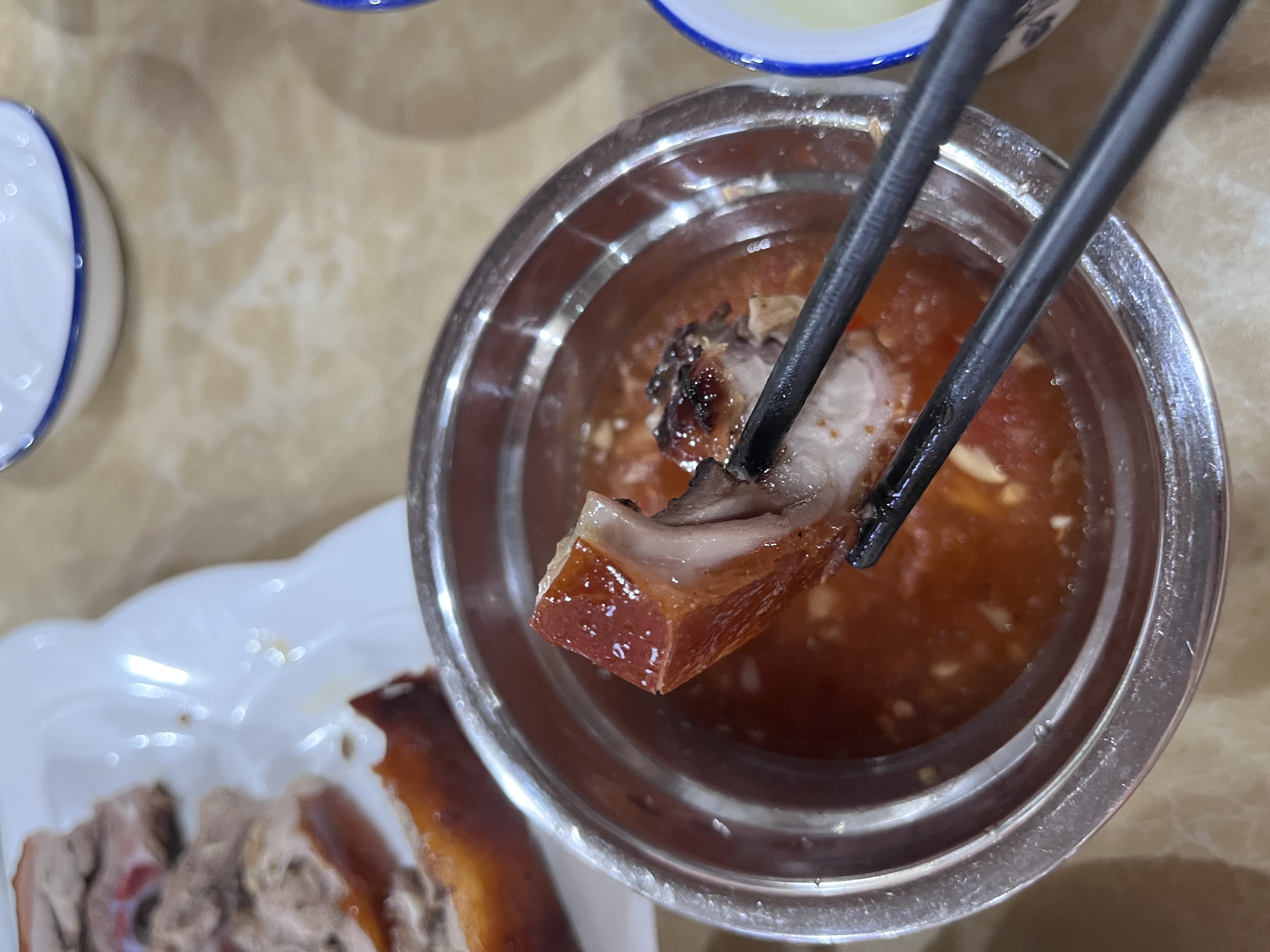 食用时,以专用刀具将整猪片成薄块,先取酥皮,再带下嫩肉,摆盘整齐。入口时,首先是“咔嚓”一声,脆皮在齿间碎裂,随后是鲜嫩多汁的猪肉在舌尖化开,咸香、甜香、肉香层层递进,令人回味无穷。搭配酸梅酱或白糖食用,更可解腻提鲜,使口感层次更为丰富。