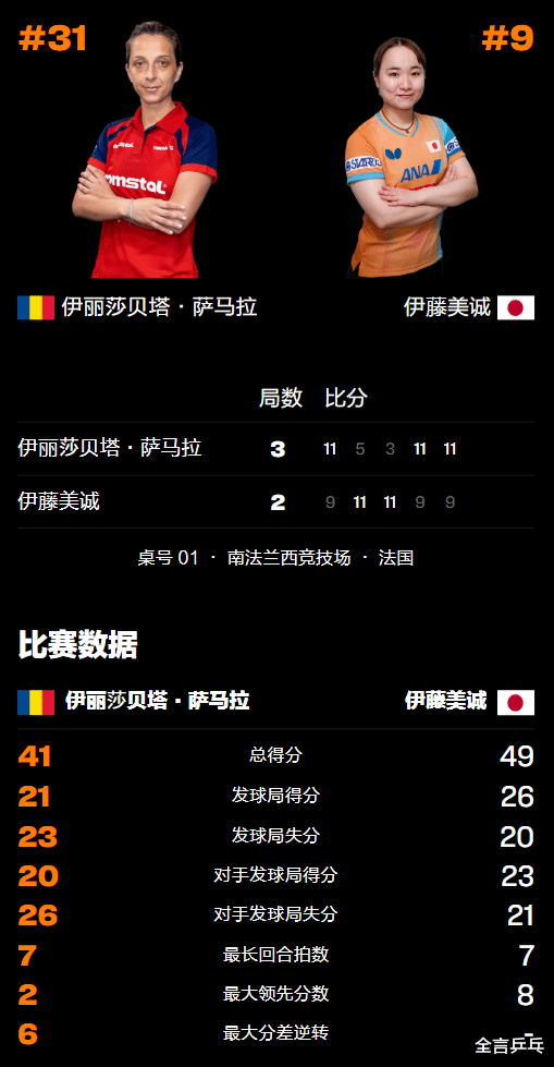 萨马拉是一位出生于1989年的老将,比伊藤美诚大了11岁,曾经拿过世界杯的单打亚军,不过早已走下坡路,此前2次与对方交手全部落败,此战想晋级无疑非常困难。