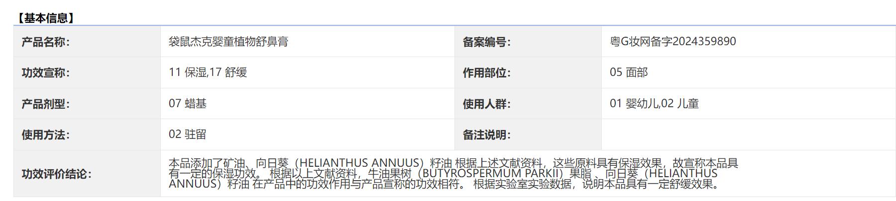 产品外包装显示,该产品执行的标准编号为:粤G妆网备字2024359890,记者查询国家药监局官网的备案信息显示,该产品的作用部位为面部,功效宣称包括保湿、舒缓,使用人群为婴幼儿、儿童,并无主播及客服声称的“改善各种鼻部不适症状”功效,作用部位也未提到鼻腔。