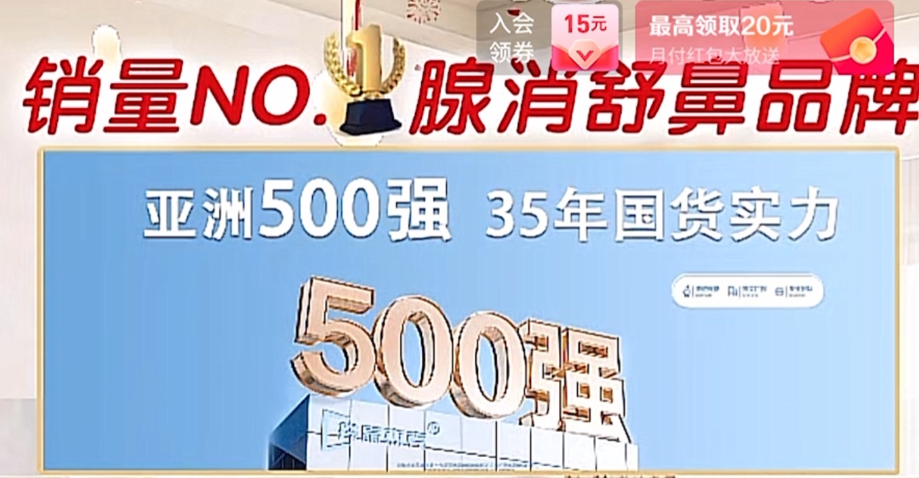 在该直播间可以看到,上方大字写着“销量NO.1腺消舒鼻品牌”,并多次出现写着“鼻敏常反复 孩子常不适”“关注宝宝面容,不做丑宝宝”字样的图片。直播间还循环播放着各种各样腺样体面容宝宝的照片,左侧写着“张嘴呼吸、爱扣爱揉、流涕喷嚏、反反复复、花粉蒿粉、敏/窦/堵/塞”字样。