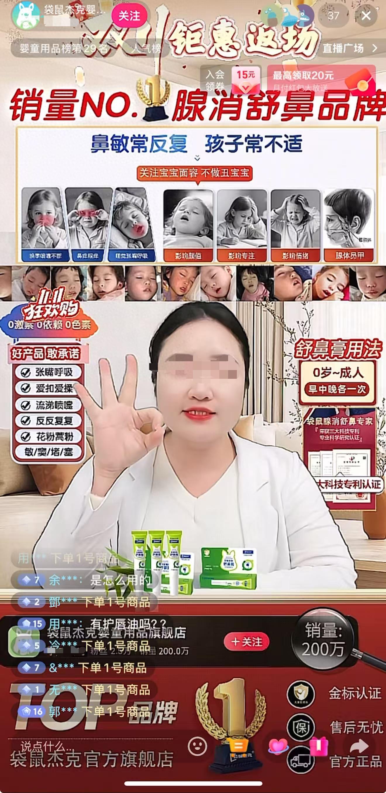 在某短视频平台“袋鼠杰克婴童用品旗舰店”直播间中,一款名为“袋鼠杰克婴童植萃舒鼻膏”的产品与解决腺样体面容等问题的关联被反复强化。