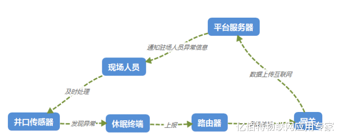 工作流程:井口传感器检测到异常 → 发送数据至对应休眠终端;