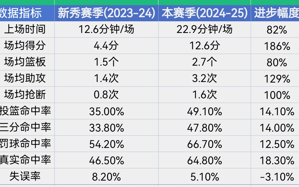 - 连续四场得分上双且真实命中率均超80%,成为NBA历史上最年轻达成此成就的后卫(21岁零3个月)