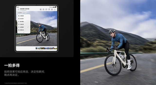 在此基础上,华为Mate X7进一步融合AI影像技术,推动创作从精准记录迈向智能表达的新阶段。其大屏AI辅助构图功能,可在拍摄时提供专业级的构图引导,帮助用户快速建立画面视觉重心;一拍多得功能,专为转瞬即逝的瞬间而生,一次按下快门,即可同步生成多张不同风格与构图的成片,让用户彻底告别错过最佳视角的遗憾;而超高动态视频,在复杂的光线环境中,依然能够呈现丰富的明暗层次与完整的画面细节,使创作自由真正突破环境与时间的限制。