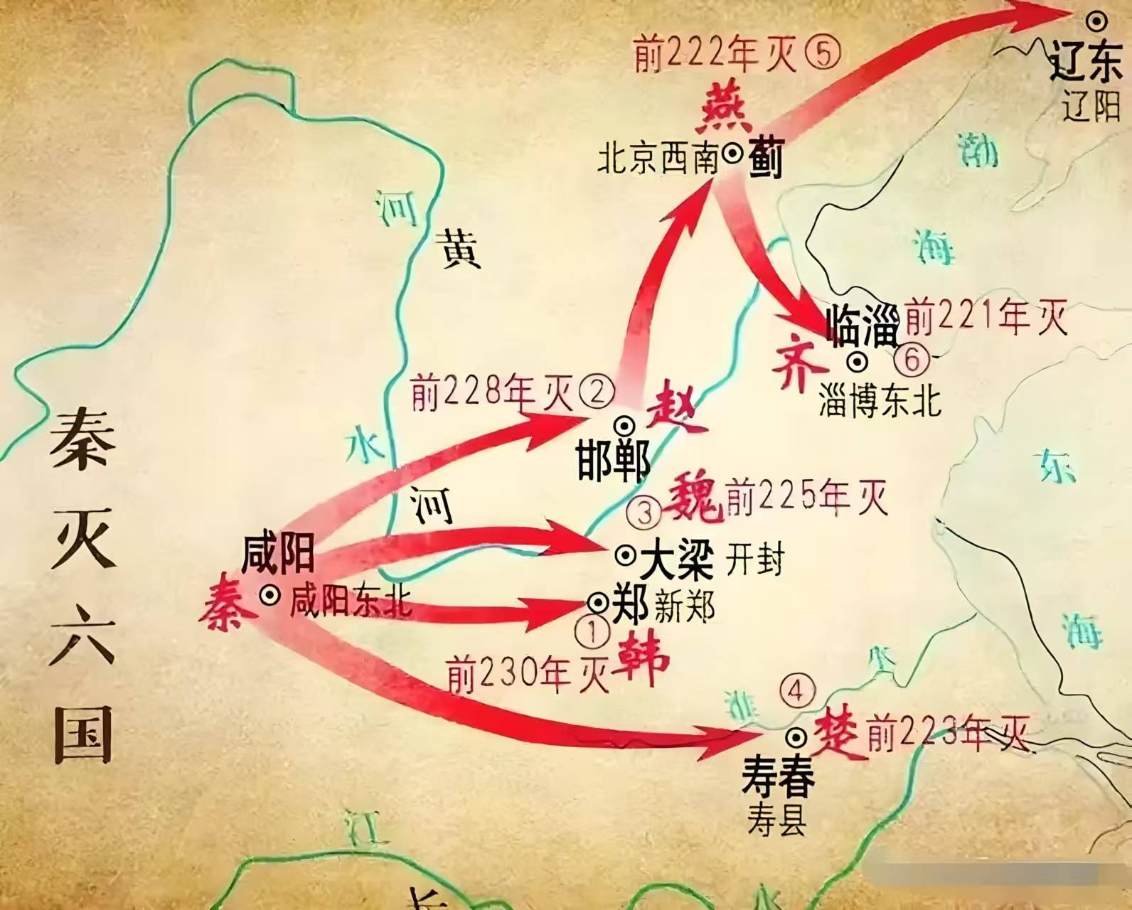 统一之役,首击近邻韩国。韩处中原腹地,为秦东进之要冲,然国土褊小,兵力寡弱,久受秦胁,国势益衰。秦王政十七年(公元前230年),遣内史腾将兵伐韩。秦军势如破竹,韩军莫之能御,旋破韩都新郑(今河南新郑),擒韩王安,尽纳韩地,置颍川郡。韩为六国首个覆灭者,秦之统一大业遂迈初阶,亦为东进扫平首障。