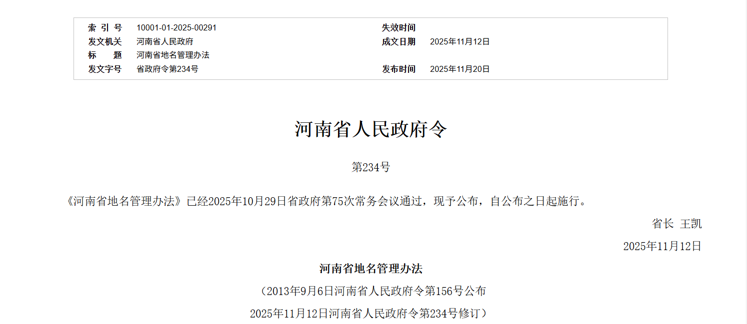 近日,河南省公布修订后的《河南省地名管理办法》,自公布之日起施行。该办法是对2013年9月6日河南省公布的《河南省地名管理办法》的全面修订,旨在加强和规范地名管理,适应经济社会发展、人民群众生产生活和对外交往的需要,传承发展中华优秀文化。