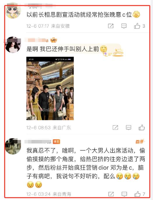 直言邓为在长相思剧宣活动就经常抢张晚意C位,这次合照也“偷偷摸摸挪个角度,给热巴挤的往旁边退了两步”。