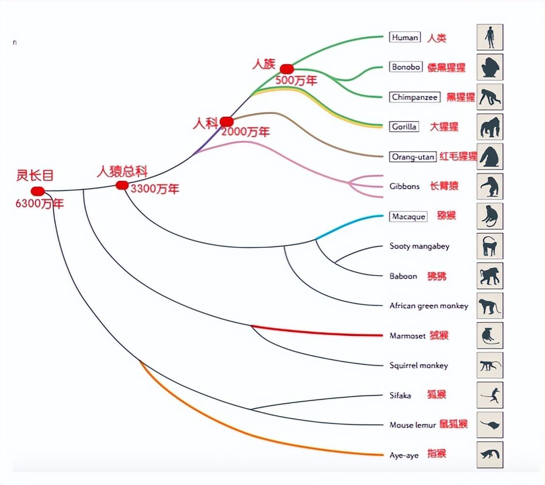 从上图可以看到,灵长目是出现在6000多万年之前,也就是说,在经历了6000多万年的进化之后,灵长目中才出现了人类这一种高等智慧生物,这样来看,人类的出现就显得不是那么突兀了。