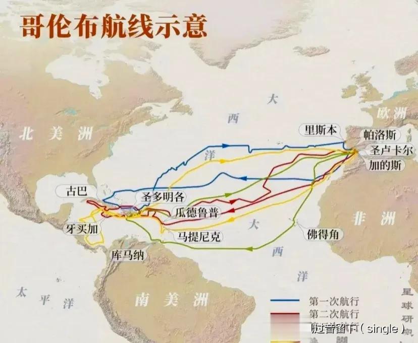 1492年-1504年间,在西班牙王室的支持下,其驾船穿越大西洋,到达中南美洲的部分地区,开辟了从欧洲横渡大西洋去美洲的航线。
