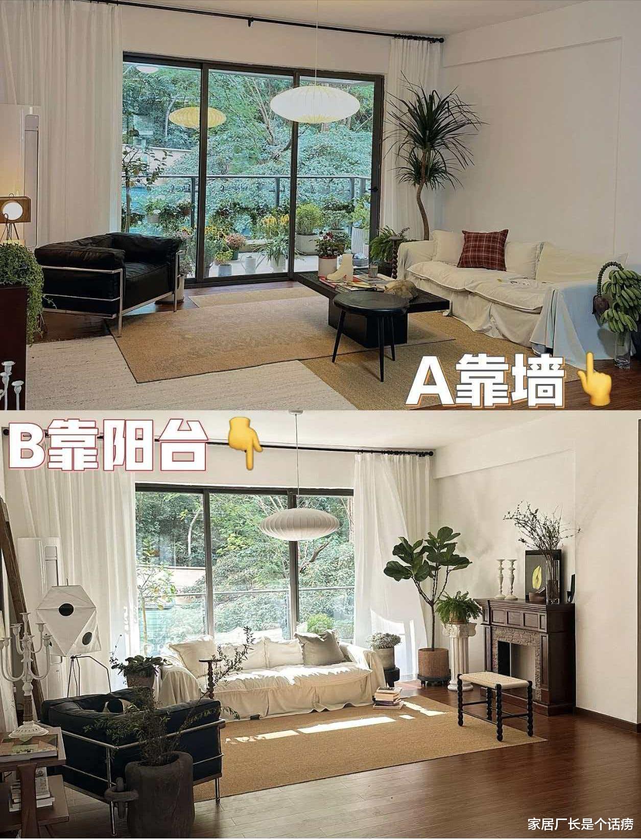 如果你家客厅连着阳台或有大窗户,试试让沙发背对窗户。白天自然光从背后打来,不刺眼还能营造氛围,晚上拉上窗帘也不影响。