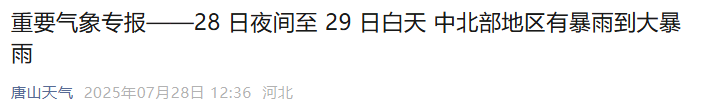 唐山市气象台发布重要气象专报我市中北部地区有暴雨到大暴雨(2025年7月28日10时)▼