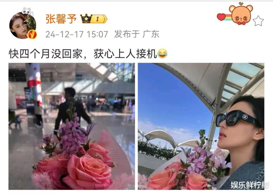 张馨予配文道:快四个月没回家,获心上人接机。短短一段文字幸福之情溢出屏幕,可以想象张馨予几个月没回家早已归心似箭,而在家等待的这位,或许也是早早地安排好了时间,手捧鲜花在机场等待,一个望眼欲穿,一个归心似箭,脑补出一副甜蜜的画面。