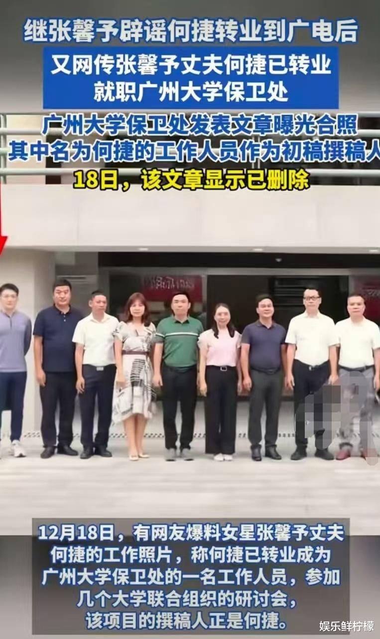 而随着网友的深扒,张馨予老公的近日动态疑似遭到网友的爆料,疑似已经转业至某大学的保卫处,而何捷与众人的合照,以及公众号稿文的署名可以佐证一二,不过这篇文章被扒出后没多久就删除了。