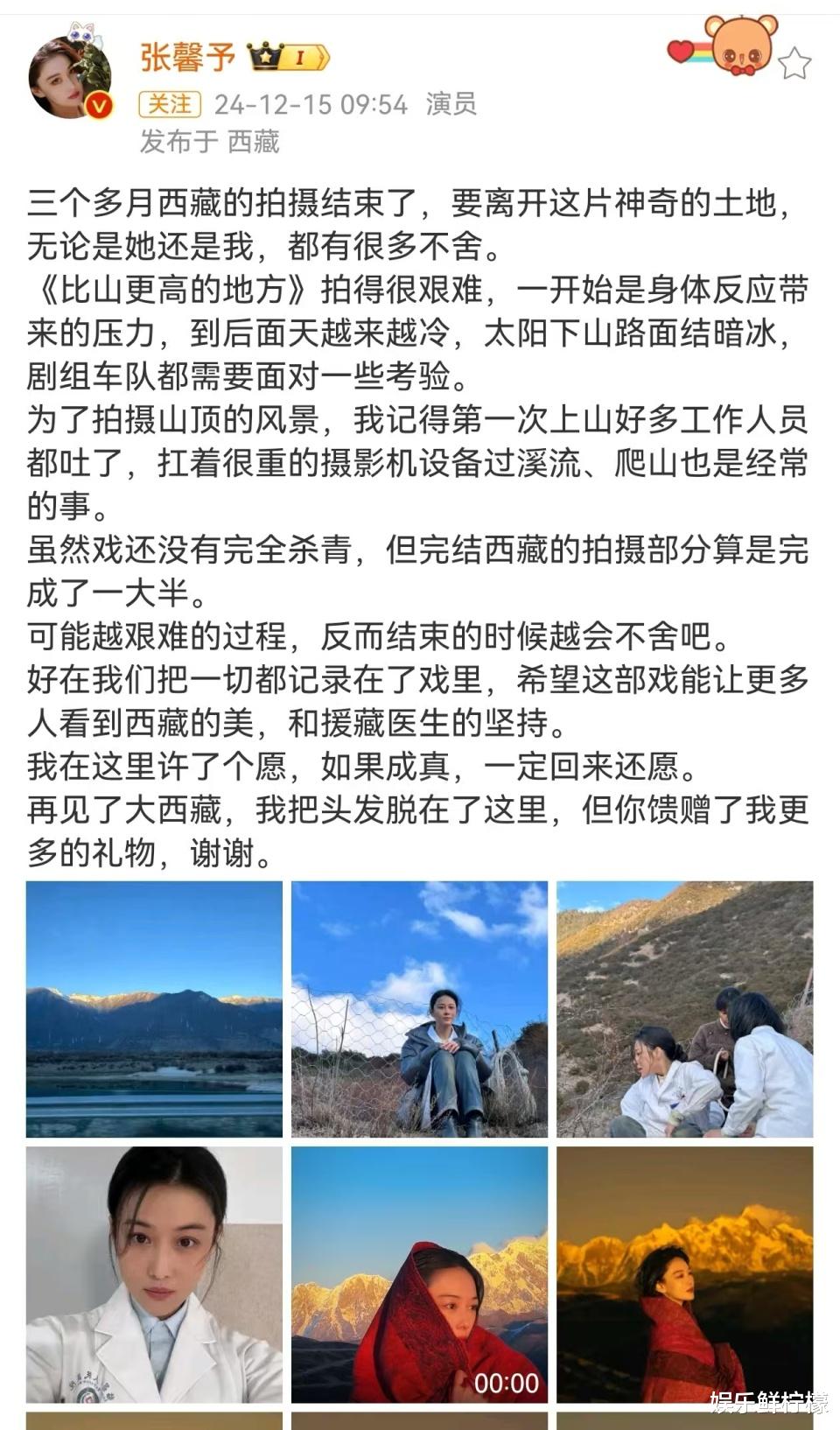 12月15日张馨予发文告别这部剧在西藏的拍摄,表示要离开这片神奇的土地,还是会有诸多的不舍,希望在这部剧播出以后,更多的人能看到西藏的美,以及为这片土地默默付出的人们尤其的援藏医生背后的辛苦。