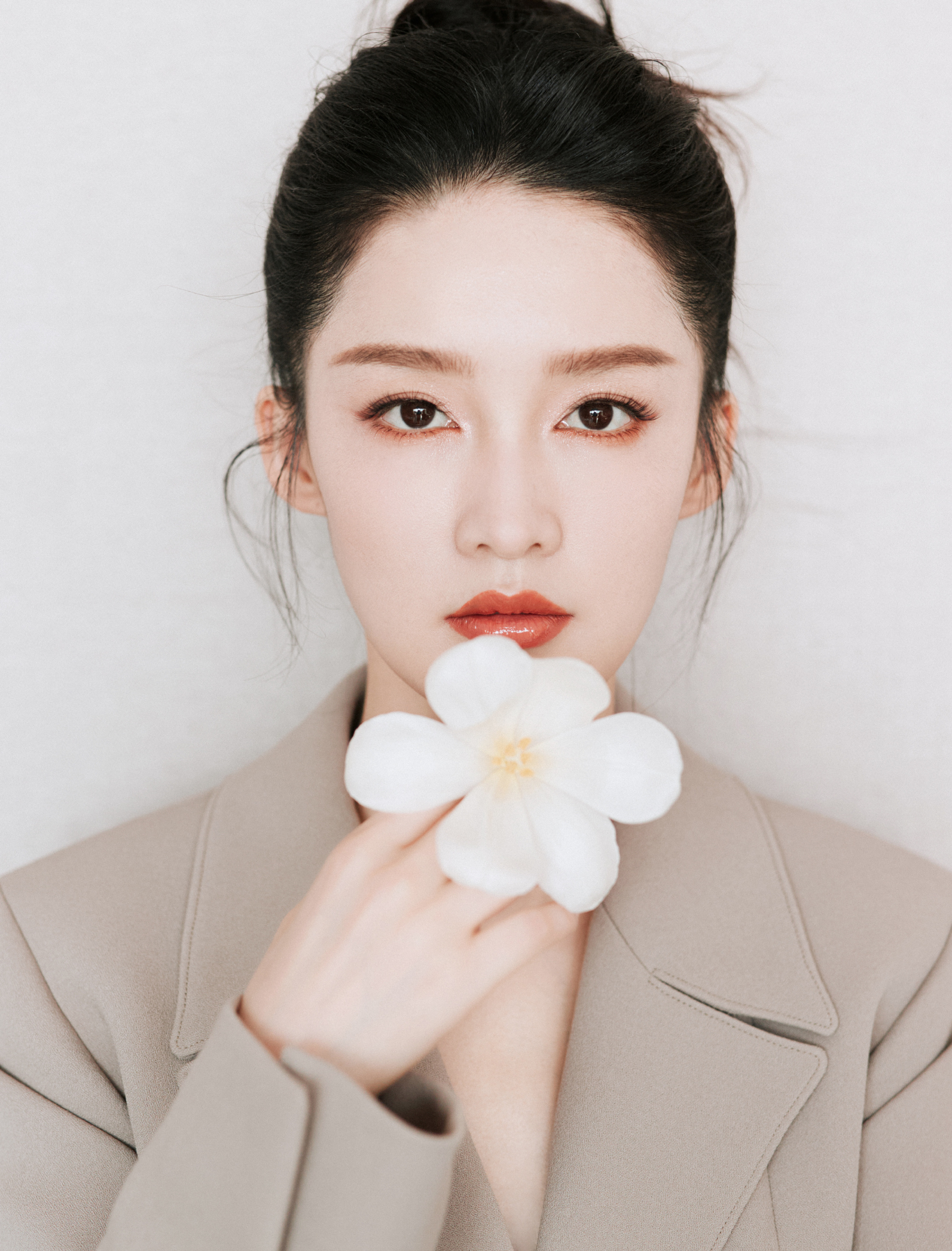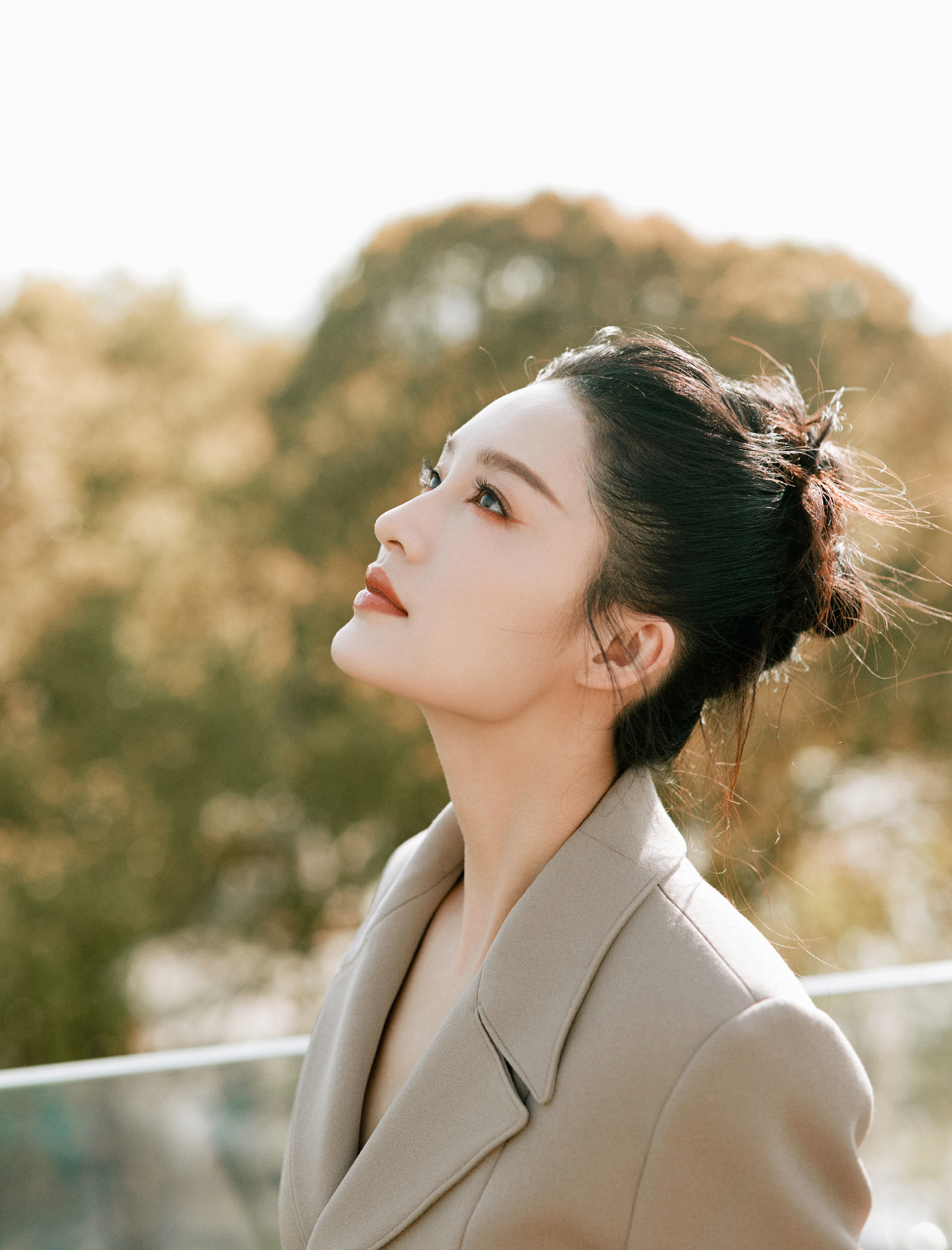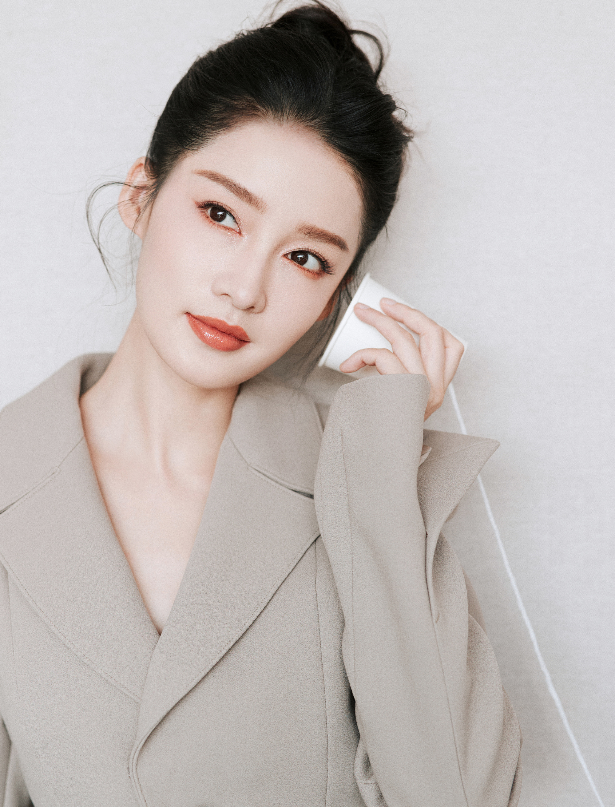 李沁的妆容精致而自然,既凸显了她的五官优势,又显得清新脱俗。她的头发被精心梳理成一款简约干练的盘发造型,既展现了她的颈部线条,又增添了几分优雅与大方。