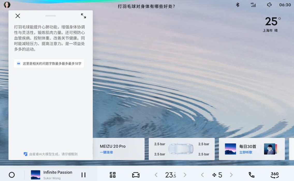 如果说绿波出行和洗车模式解决了“行”与“养”的痛点,那么车机AI银河精灵则让座舱变成了“私人助理”。基于星睿大模型开发的AI精灵,支持情感互动、资讯查询、用车解答等多场景服务:开车时想听某首歌,只需说“播放周杰伦的晴天”;想了解车辆功能,问一句“怎么开启外放电”,它会图文并茂地演示操作步骤;甚至能根据用户需求推荐周边露营地或美食。更值得一提的是,手机端的AI银河精灵还能实现“导航一键发送到车”,上班前在微信里和精灵说一句“导航到公司”,上车后车机自动同步路线,彻底告别上车后手忙脚乱输地址的尴尬。