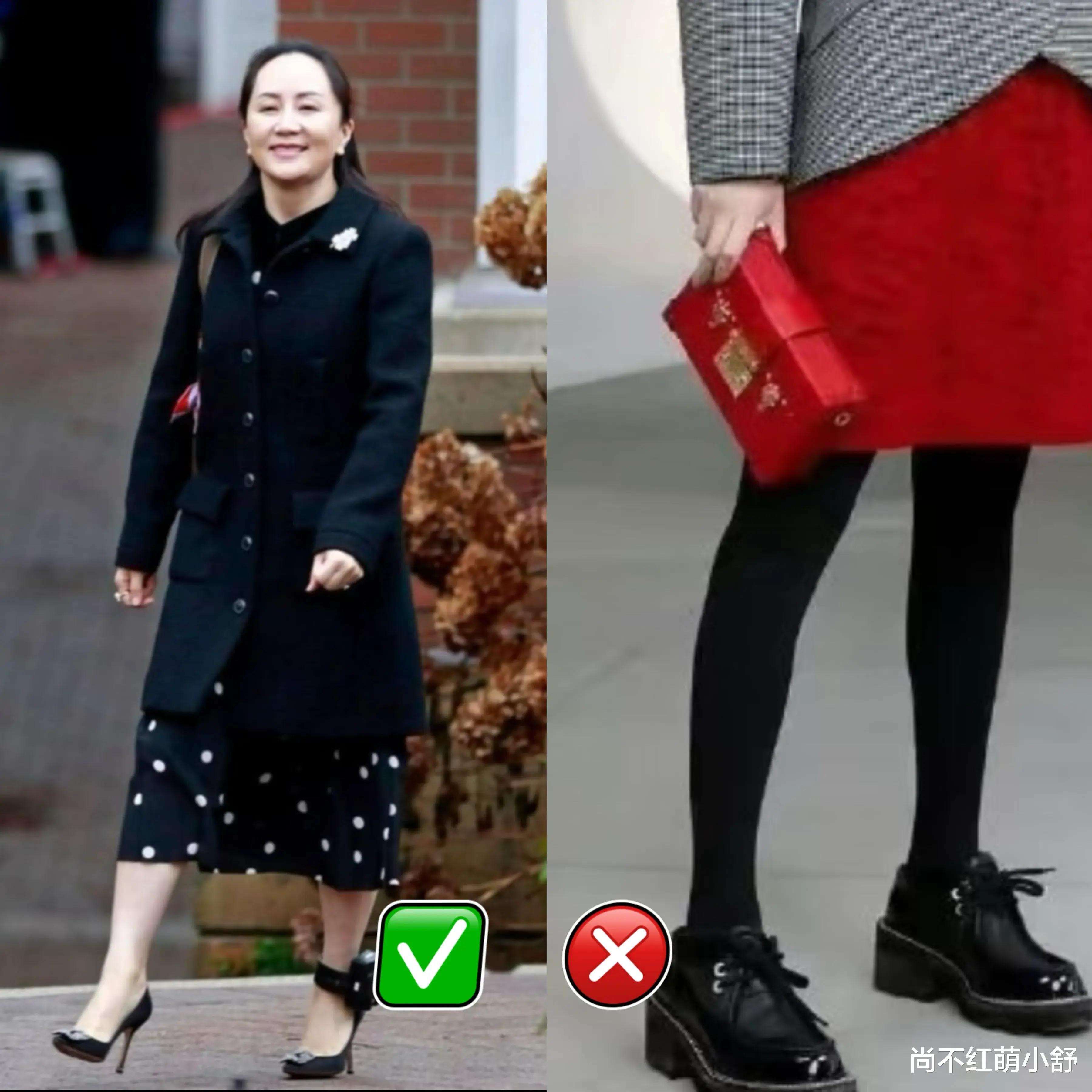 所以说,很多时候,丝袜的加入,尤其是反光性强或质感廉价的款式,容易产生“画蛇添足”的效果。像孟晚舟、何超琼这样选择清一色选择光腿穿搭,反而更凸显裙装的面料垂坠感和剪裁精度。