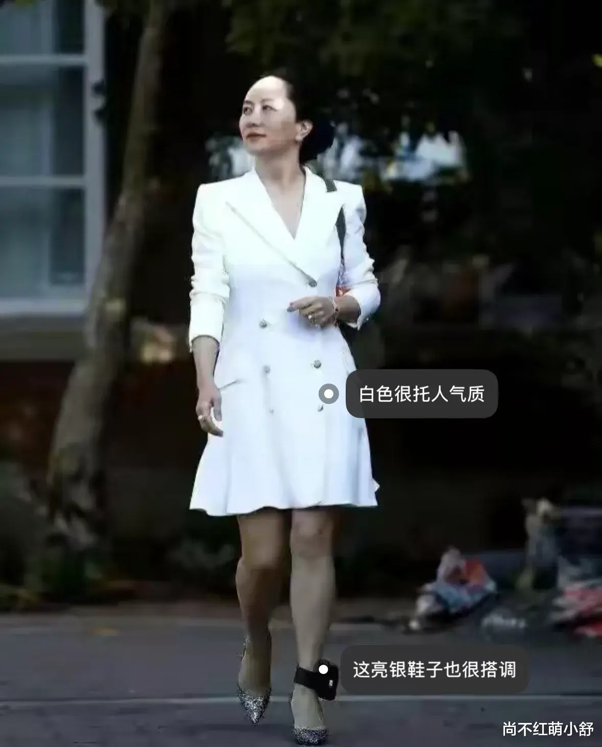 1)孟晚舟的“柔中带刚”穿搭技巧:白色西装连衣裙 + 简约首饰 + 裸色高跟鞋