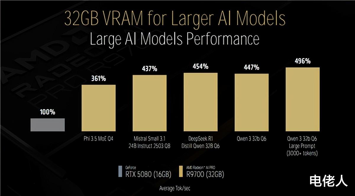 该卡采用Navi 48 XTW核心(代表工作站),CU单元数为64个(4096流处理器)、64个光追加速器、128个AI加速单元,整卡功耗高达300W。峰值AI性能达到96 TOPS(FP16)、1531 TOPS(INT4),是上代产品的两倍。