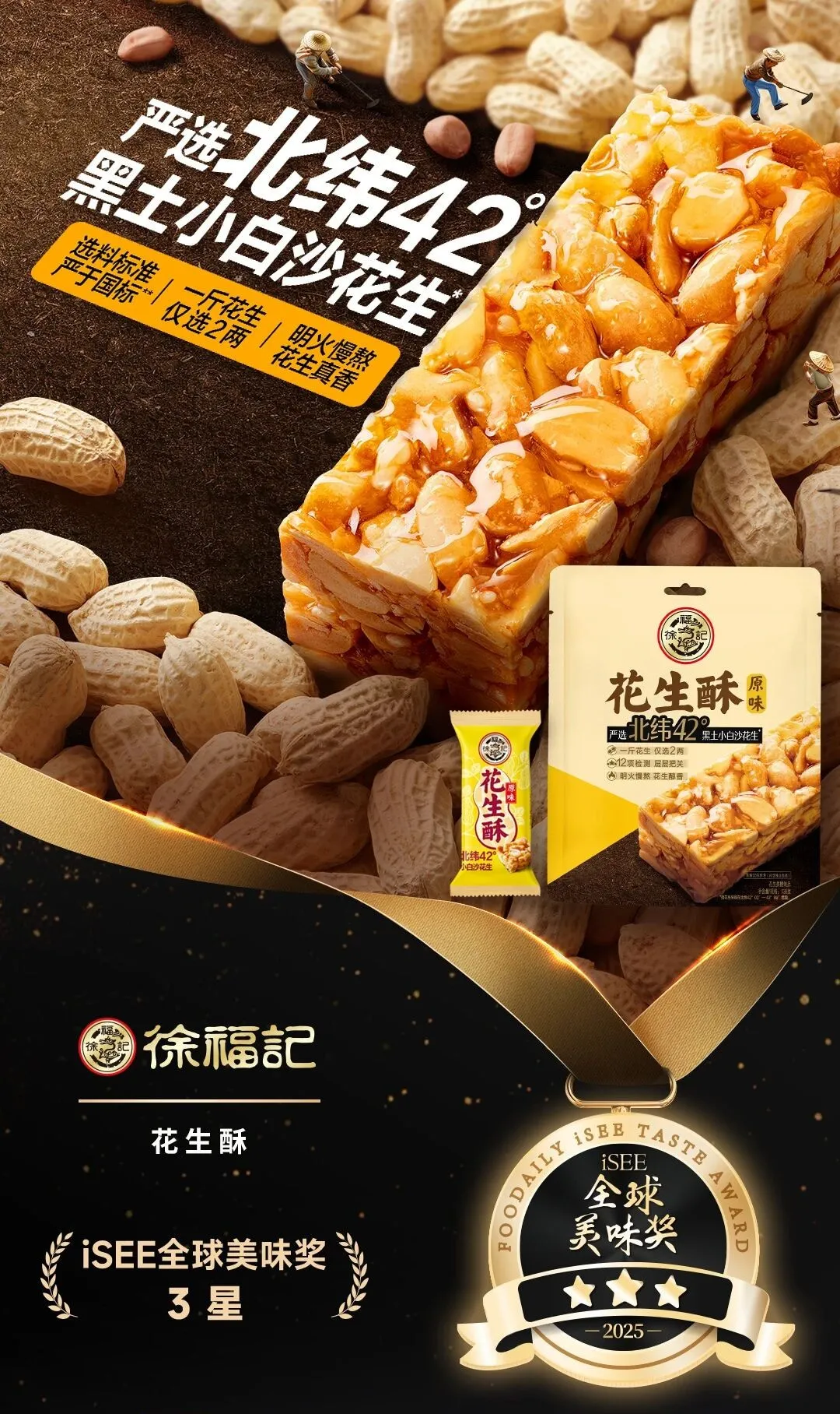 “12项监测,其中黄曲霉毒素B₁≤15μg/kg,比国标≤20μg/kg还严”“一斤花生仅选2两”“严选北纬42°黑土小白沙花生”,在徐福记的溯源活动中,这些品质承诺被转化为可触摸、可体验的场景,让消费者的信任从听说变成确信。
