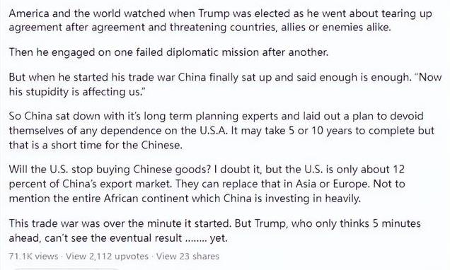 众多外国网友针对这件事情也纷纷发表了一方面认为特朗普言论几乎没有根据,中国不会因他而崩溃;