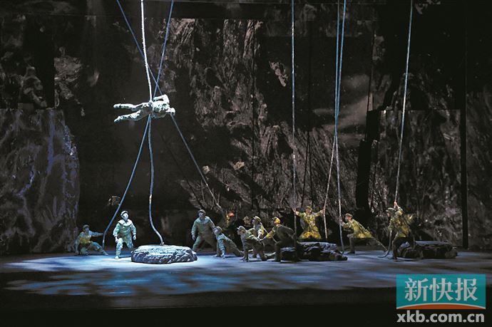 新快报记者在现场看到,在大雪纷飞的布景,悲壮低沉的背景音乐中,演员们“艰难”地在悬挂的长绳间飞跃,伴随着动画背景里的雪崩和落石,再现了当年修路环境的恶劣。在一段空中飞人的演出结束后,舞台上矗立的两座山之间,巧妙地架设出了一条钢丝,国家级非遗达瓦孜绝活正式亮相。