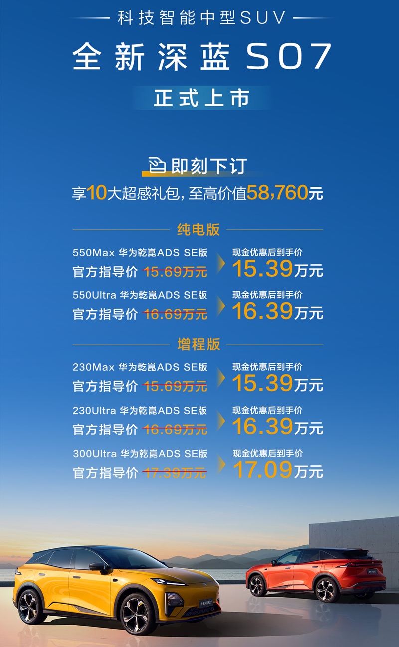 全球领先的制造能力,也为深蓝旗下车型提供了全面的品质保障。此次同步上市的全新深蓝S07,定位“15万级标配华为乾崑豪华SUV”,在豪华、舒适、智能、动力四大价值维度重塑同级智能豪华SUV价值标杆。