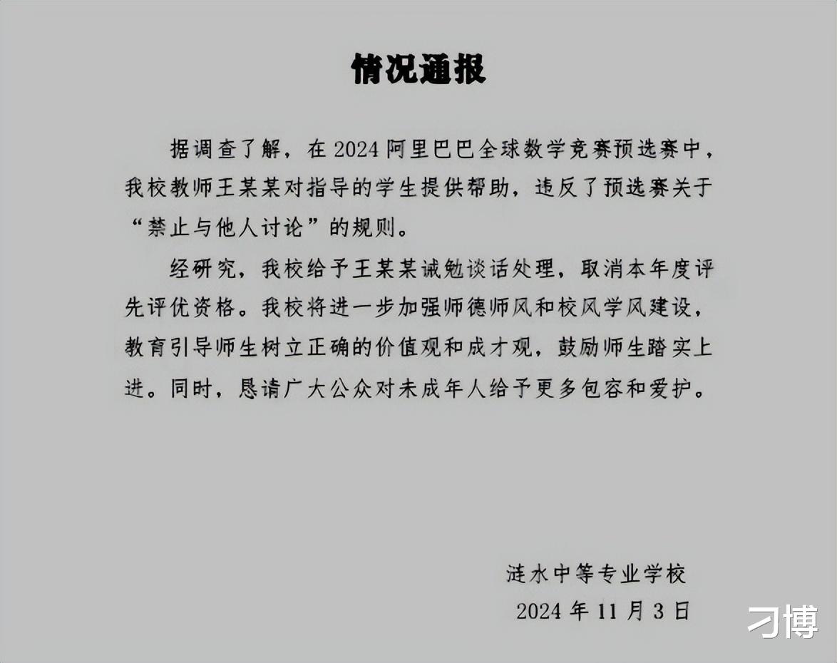 被全网吊打几个月后,姜萍事件终于有了消息。阿里巴巴全球数学竞赛组委会及姜萍所在的涟水中等专业学校近日对有关情况进行说明,说明中称,在阿里巴巴全球数学竞赛预选赛中,姜萍的老师王某某(王闰秋)对指导的学生提供帮助,违反了预选赛关于“禁止与他人讨论”的规则。涟水中等专业学校对王闰秋给予“诫勉谈话处理,取消本年度评先评优资格”。