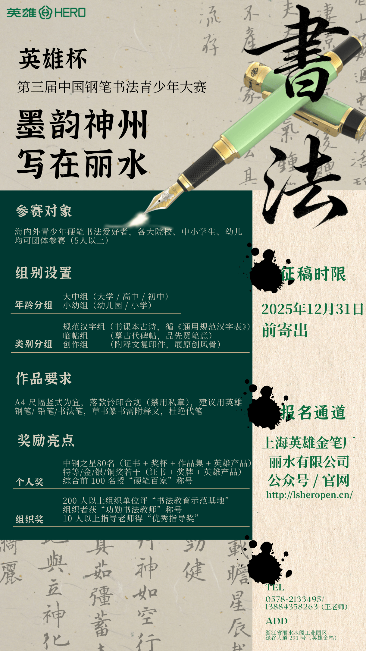 如果你家孩子喜欢书法,或者你是书法老师想组织学生参赛,别错过12月31日的征稿截止日期,赶紧去上海英雄金笔厂丽水有限公司官网报名吧!