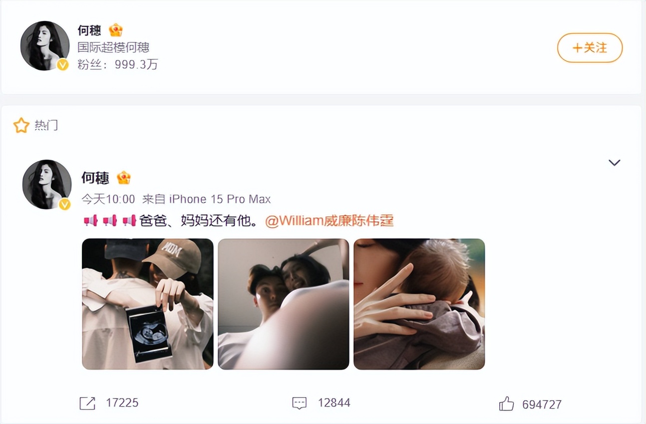 在陈伟霆发布的同时,何穗也在官宣,内容还是一样的,只不过第三张换成了何穗与儿子的背影照。
